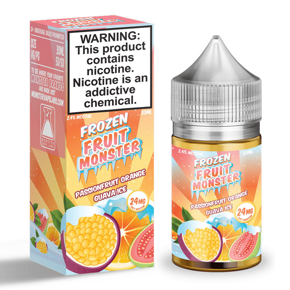 Passionfruit Orange Guava Ice By Frozen Fruit Monster – Salt Nicotine – 30ml (TFN)” is an e-liquid designed for those who prefer a smoother nicotine experience in a convenient 30ml bottle, featuring a delightful blend of tropical fruit flavors and a cooling ice element, all enhanced with TFN (Tobacco-Free Nicotine).