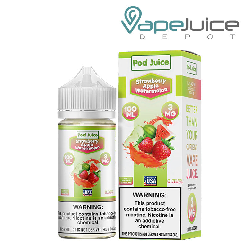 This triple fruity Strawberry Apple Watermelon Pod Juice TFN freebase e-liquid is infused with tobacco-free nicotine. So be ready that it is going to be juicy and savory. Pod Juice made it a refreshing blend of fresh-cut red watermelons, crisp red apples, and luscious ripe strawberries. When you start drawing vapors, you will notice that this sweet burst creates a perfect balance of sweet and sour each time you inhale. It’s no wonder Strawberry Apple Watermelon vape juice has become one of the best sellers!